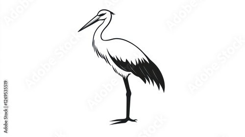 stork, bird, wildlife, nature, animal, illustration, graphic, black, white, drawing, vector, art, design, monochrome, silhouette, elegant, profile, side, feathered, wingspan, standing, feather, avian, flightless, flying, feathering, portrait, stylised, vignetting, line, simple, outline, beauty, detailed, figure, animal, poster, print