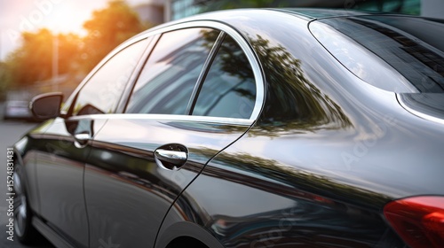 Side view of car window tint, ceramic film provides heat rejection and UV protection with stable color, car film installed on the glass surface of the , selected focus car tinting service