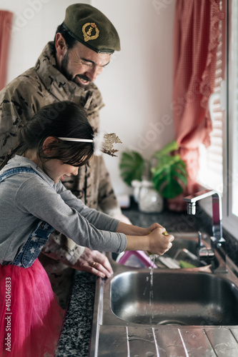 Side view of cheerful military man in uniform standing at sink with adorable daughter and washing dishes together in kitchen at home