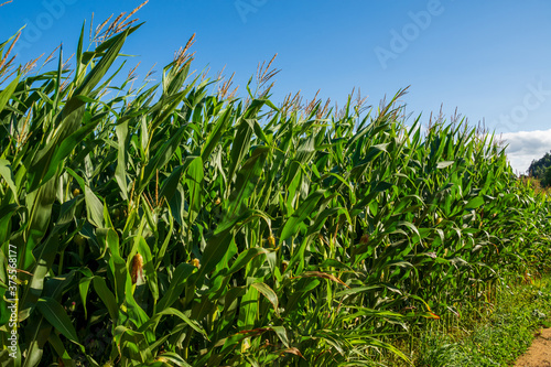 Side view of corn plantation with blue sky, in Cantabria, Spain, horizontal