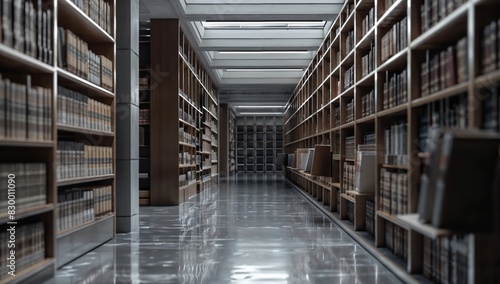 Side view of empty, immaculate library stacks with organized book collections