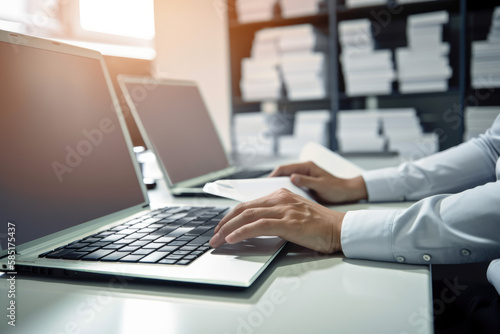 Side view of hands typing on laptop keyboard. Generative AI