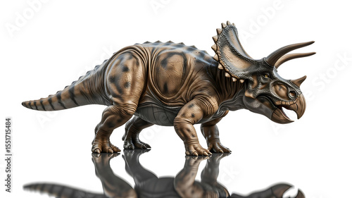 triceratops, dinosaur, sideview, profile, herbivore, horn, frill, quadruped, reptile, extinct, prehistoric, texture, leathery, realistic, scale, glossy, white, background, isolated, pose, stance, detailed, fossil, ridge, skull, head, powerful, strong, ancient, armored, nature, anatomy, lighting, shadow, species, render, paleontology, animal, jurassic, dino, monster, toy, lizzard, three-dimensional, cretaceous