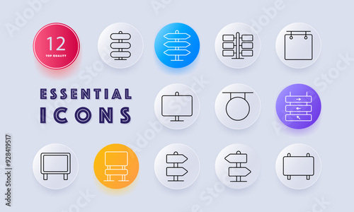 Signage set icon. Signboard, billboard, direction, street sign, road, wayfinding, navigation, pointer, guide, location, map, advertisement, information, symbol, post, traffic, message, communication