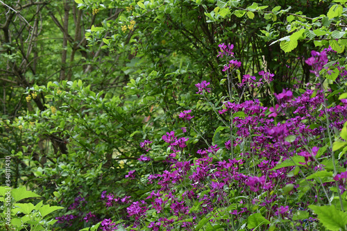 Silberblatt, Lunaria, in voller Blüte am Waldrand