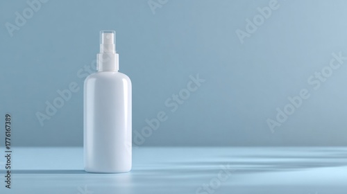 Silent white spray bottle stands elegantly on azure surface, capturing minimalism's essence; perfect for New Year cleaning rituals