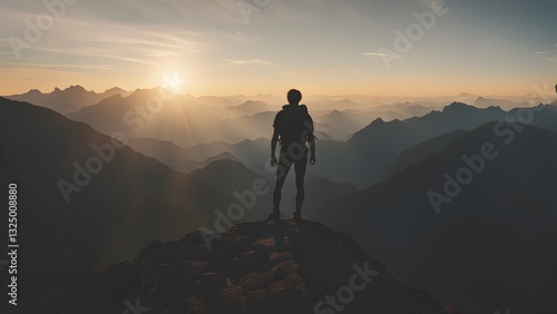 Silhouette a hiker standing a mountain peak sunset, overlooking a vast mountain range.
