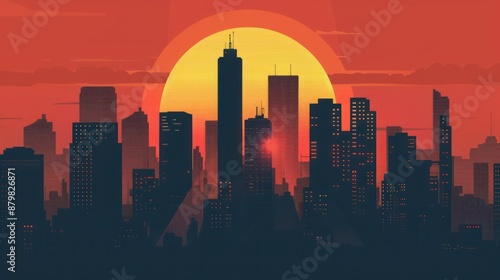 city landscape, sunset, building, skyline, silhouette, urban, architecture, skyscraper, city, night, twilight, horizon, gold, hours, dawn, dusk, red, orange, yellow, light, dark, shadow, contrast, graphic, minimalism, vector, illustration, design, art, artwork, abstract, background, scene, view, modern, contemporary, style, aesthetic, photo, photo, digital