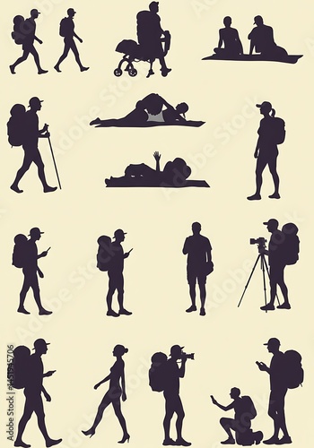silhouette, people, walking, hiking, backpacking, travel, photo, camera, tripod, relaxing, lying, sitting, pushchair, phone, backpack, leisure, activity, recreation, figure