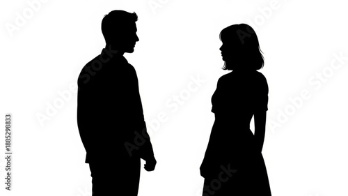silhouette, couple, man, woman, facing, each, other, isolated, white, background, studio, shot, people, male, female, together, human relationships, communication, conversation, dialogue, meeting, standing, figure, shadow, dark, contrast, simple, minimalist, clean, modern, elegant, formal, casual attire, outfit, dress, shirt, hair, style, profile, side, view, outline, shape, form, human, person, identity, sex, pair