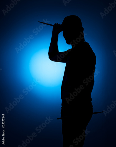 silhouette Expressive young drummer with drum stick on a blue background