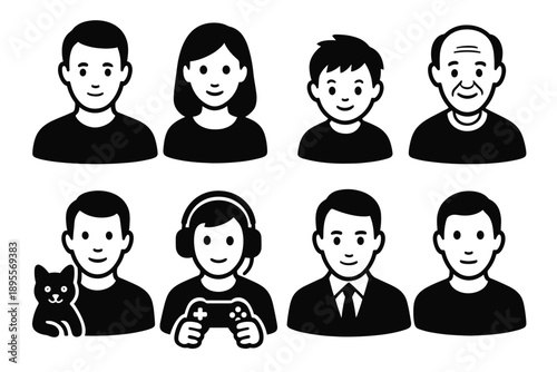 silhouette, face, icon, bold, people, pet, diverse, character, simple, avatar, black, white, male, female, cat, headset, gamer, family, portrait, young, elderly, children, adult, casual attire, formal, buttons, outline, minimalist, cartoon, expression, humanity, lifestyle, modern