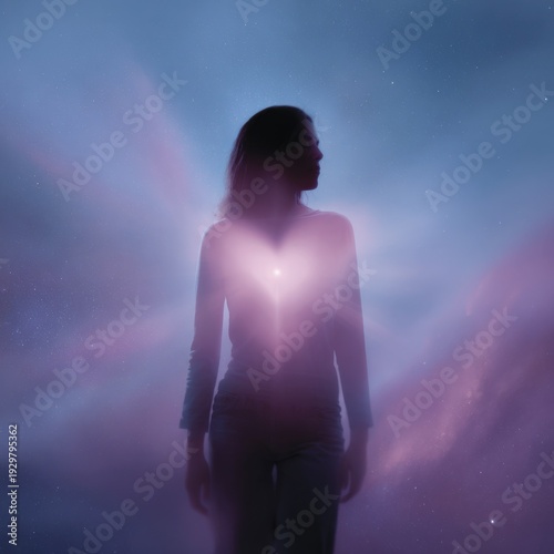 Silhouette female young heart glowing within chest ethereal aura portrait in soft purple galaxy mist symbolizing inner light and emotional awakening