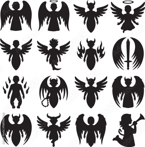 angel, devil, daemon, wing, halo, horn, fire, sword, trumpet, silhouette, icon, symbol, fantasy, mythology, good, evil, supernatural, character, design, illustration, graphic, collection, set, angel wings, celestial, infernal