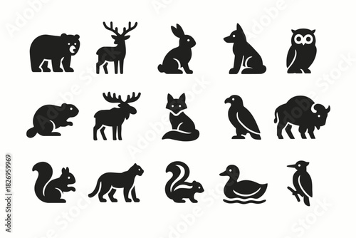 silhouette, icon, animal, timberland, design, bear, cervid, rabbit, dog, owl, beaver, moose, fox, bird, bison, squirrel, cougar, duck, woodpecker, nature, wildlife, simple, black, graphic, illustration, set, fauna, collection, forest, diverse, species, symbol, shadow, icon, vector