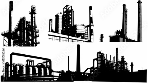 Silhouette illustration showcasing industrial plants with smokestacks and complex piping systems in black and white