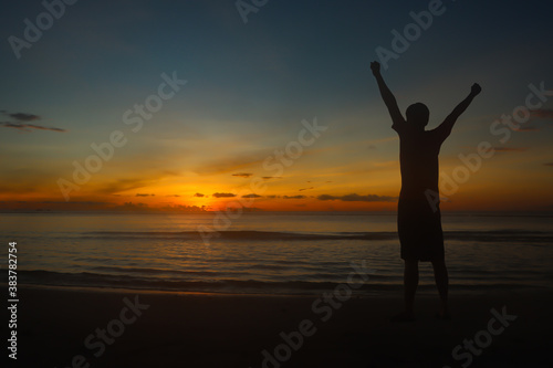 Silhouette man raise their arms on the beach in morning with sun rise.
