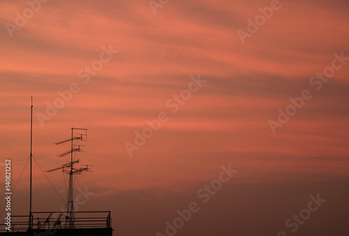 Silhouette of TV Antenna against Beautiful Pink Cloudy Sky at the Twilight of Bangkok, Thailand