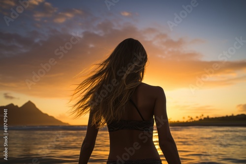 Silhouette of a beautiful woman in bikini on the beach at sunset, Female surfer rear view in the sea at sunset, Oahu, Hawaii, United States of America, AI Generated