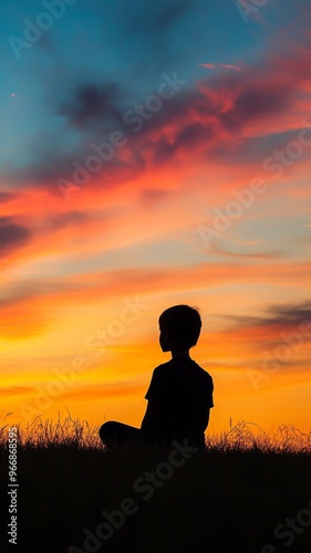 Silhouette of a boy sitting against a vibrant sunset sky, peaceful nature reflection concept
