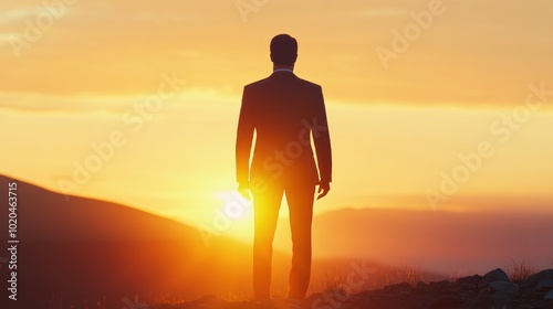 silhouette of a businessman standing on a hilltop,