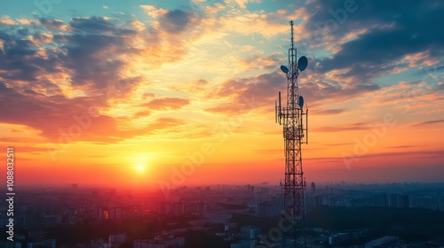 sunset, sky, cloud, city landscape, city, skyline, urban, tower, antennae, mobile phone, phone, communication, network, technology, signal, wireless, telecom, infrastructure, horizon, aerial, view, dusk, evening, red, orange, yellow, blue, light, silhouette, background, abstract, modern, industrial, business, structure, high, metal, steel, mast, pole, satellite, dish, digital, broadcast, transmit, antennae, radio, city landscape, sun
