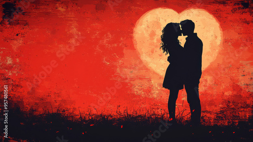 Silhouette of a couple kissing in front of a large glowing heart on a red background. Romantic artwork, love, intimacy, Valentine's Day, passionate embrace.
