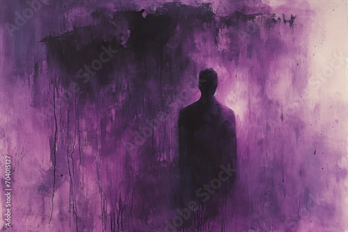 Silhouette of a dark lonely person, purple background, thick ink texture, doom, desolation, darkness, emptiness