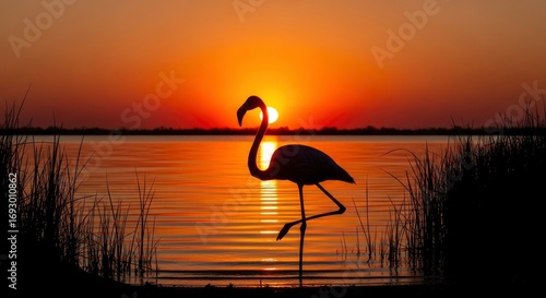 Silhouette of a flamingo standing on one leg in tranquil water at sunset with the suns reflection and tall grasses on the shore
