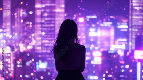 silhouette of a girl in front of a big city with purple lights