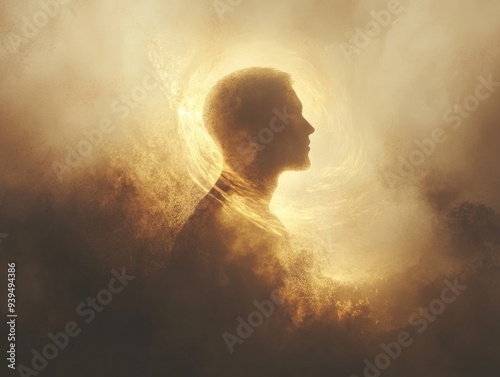 silhouette, human, head, gold, mist, halo, light, dreamy, aethereal, mysterious, artistic, conceptual, introspective, shadow, abstract, glow, atmospheric, fantasy, meditation, nirvana, spirituality, aura, dreamlike, serene, cosmic, vibrant, illumination, peaceful, transcendence, imagination, mystic, fog, surreal, divine, soul, calm, harmony, contemplation, visionary, mysticism, inspiration, consciousness