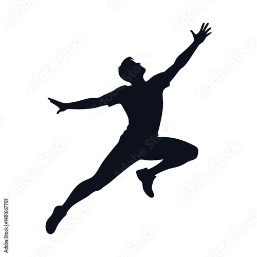 man, silhouette, leaping, jump, open, arm, flying, freedom, energy, joy, victory, success, motion, outline, figure, dark, happy, expressive, strength, pose, design, up, skyward, action, hopeful, power, spiritual, clean, modern, vector, human, uplifting, art, graphic, bold, high
