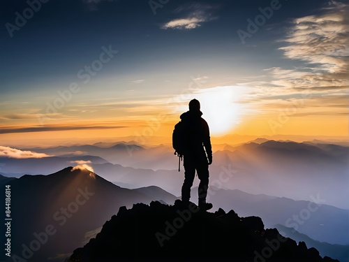 Silhouette of a man on top of a mountain peak.