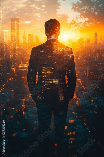 Silhouette of a Man Overlaid with a Cityscape at Sunset