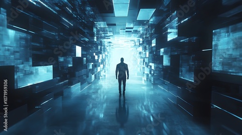 Silhouette of a man walking towards a glowing blue digital corridor.