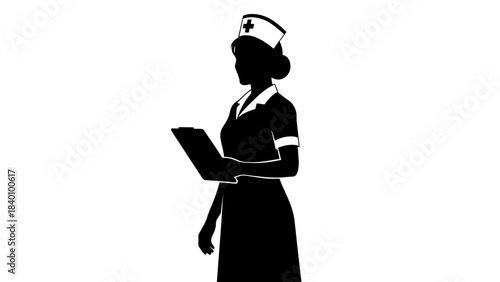 nurse, silhouette, woman, female, medicals, health care, hospital, clinic, professional, uniform, cap, clipboard, document, paper, information, datum, care, patient, doctor, medicine, health, treatment, diagnosis, research, study, analysis, work, job, career, occupation, service, assistance, support, helping, aid, person, figure, outline, shape, dark, black, white, background, simple, minimalist, graphic, illustration, icon, symbol