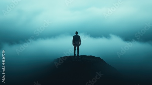 Silhouette of a person standing on a hill in foggy atmosphere.