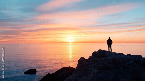 Silhouette of a person standing on rocks against a vibrant sunset over the ocean : Generative AI