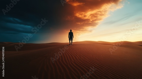 Silhouette of a Person Standing on Sand Dunes Under Dramatic Sky at Sunset in Desert Landscape