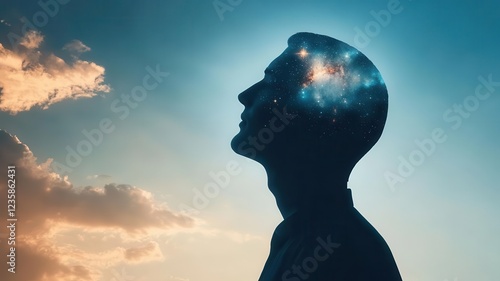 Silhouette of a person with a cosmic galaxy inside their head, symbolizing creativity, imagination, and introspection. Creativity idea and vision concept.