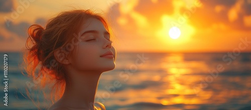 Silhouette of a serene young girl enjoying a peaceful sunrise over the tranquil sea with vibrant colors in the sky