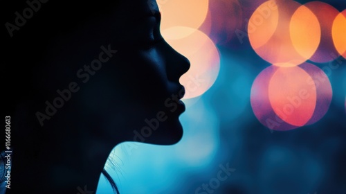 woman, silhouette, night, city, light, bokeh, dark, profile, face, female, portrait, beauty, mystery, dreamy, romantic, serene, calm, peaceful, hopeful, intriguing, enigmatic, shadow, urban, background, texture, glow, colours, blur, artistic, abstract, photographic, image, photo, visual, art, graphic, design, mood, feeling, expression