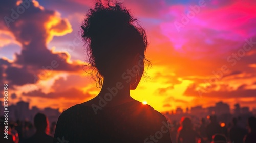 Silhouette of a woman from the back set against a colorful sunset backdrop surrounded by a bustling outdoor gathering