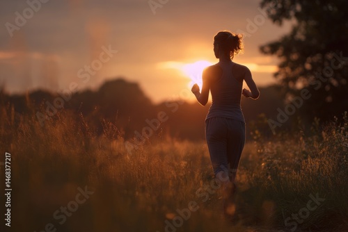 woman, jogging, sunset, silhouette, running, field, grass, golden hour, evening, outdoors, healthy, exercise, fitness, caucasian, female, young adult, athletic, active, nature, landscape, peaceful, tranquil, serene, backlit