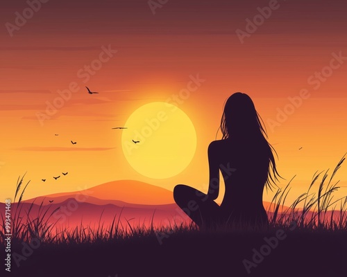 Silhouette of a woman meditating at sunset near a tranquil landscape with mountains and birds