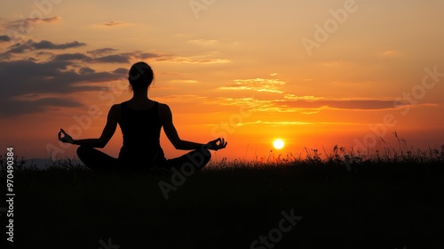 Silhouette of a woman meditating at sunset, with a fiery sky behind her.