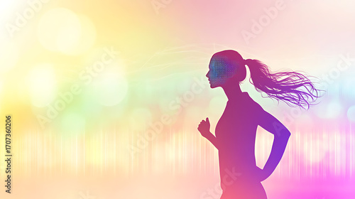 Silhouette of a woman running against a vibrant, colorful background with light effects