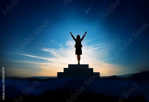 up high, achievement, ambition, arm, aspiration, background, beautiful, bright, celebration, cloud, confident, darkness, determined, dream, dusk, evening, female, future, goal, happy, high, hope, horizon, inspirational, joy, landscape, light, look, motivation, mountain, night, optimism, platform, powerful, raised, shadow, silhouette, sky, standing, success, sunset, top, victory, view, woman