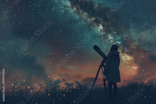 Silhouette of a woman who explores the starry sky through a telescope, against the backdrop of a starry night