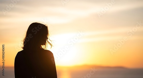 silhouette, woman, female, person, backview, hair, curly hair, sunset, sunrise, evening, dawn, golden hour, orange sky, yellow sky, cloud, ocean, sea, water, horizon, landscape, scenic, beautiful, nature, outdoors, serene, peaceful, calm, tranquil, contemplation, thoughtful, solitude, alone, meditation, dreamy, atmospheric, warm colors, light, glow, background
